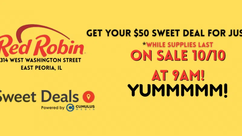 Grab your Red Robin Sweet Deal this Friday at 9am right here>>> Yummmm! Discover the delicious new Big Yum Burger Deal at Red Robin, located in the vibrant Levee District of East Peoria. Savor Red's Double Tavern Burger with your choice of a bottomless side and a bottomless beverage for just nine ninety nine! ...