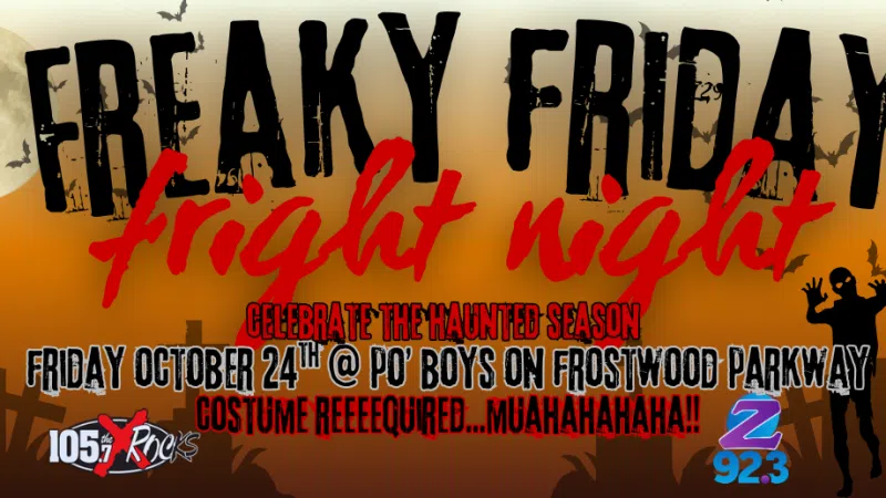 Hear the details here about our Freaky Friday Pre Halloween Party happening Friday Night October 24th. Then another surprize location on Friday Night October 31st! Z923 has Halloween covered this October, were gettin freeeeakyyyyy! Cuz on FRIDAY NIGHT, October 24th, from 7-9 (and much later) get to Po Boys on Frostwood...